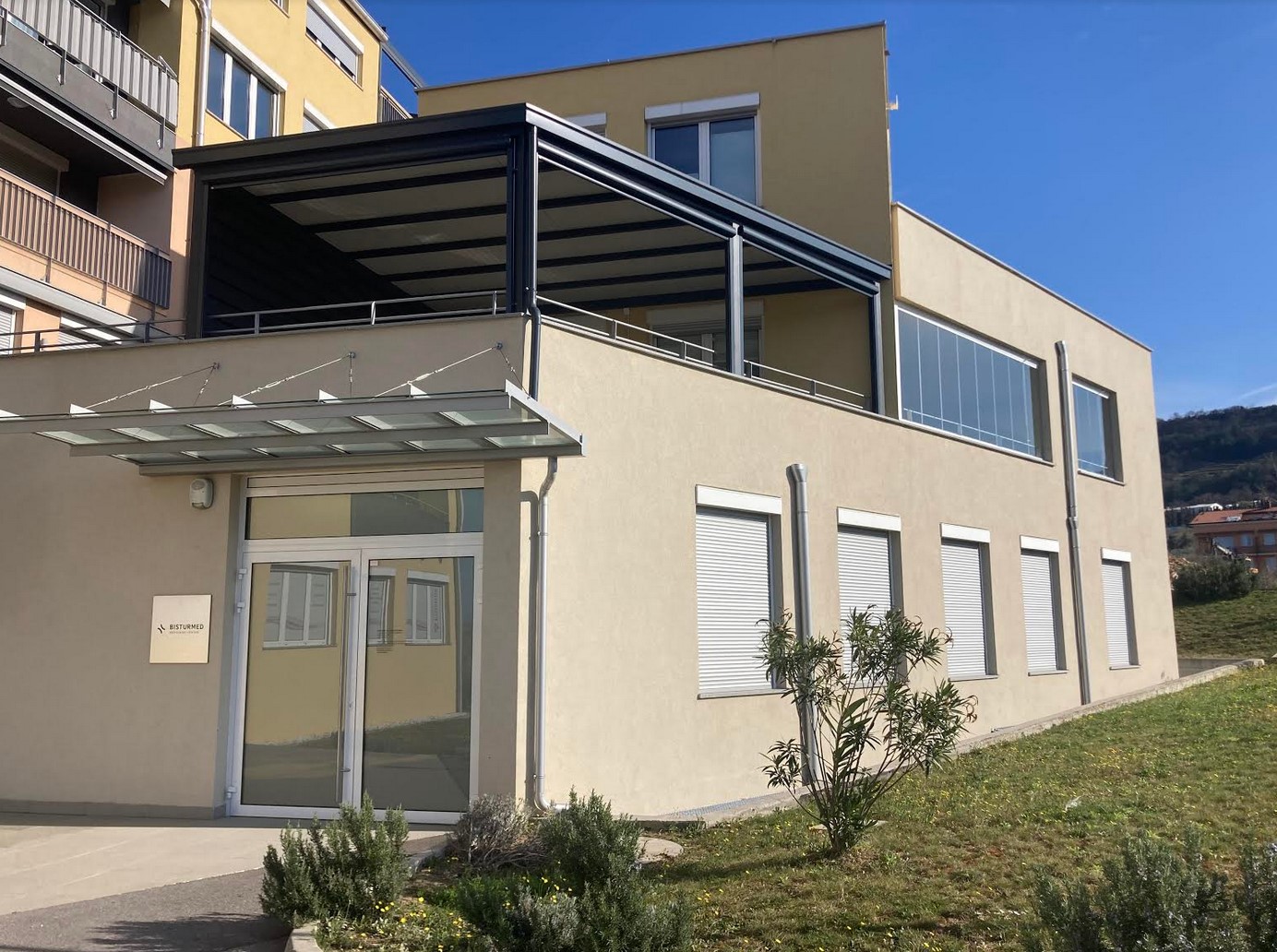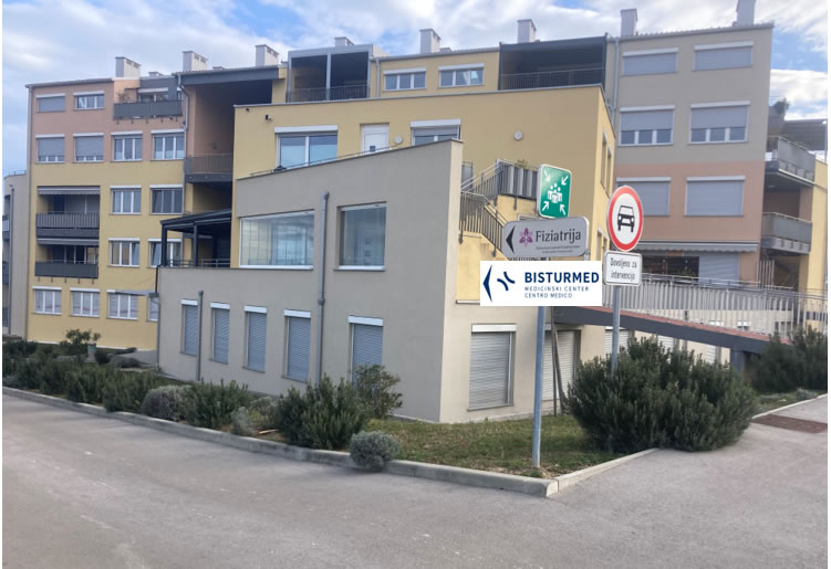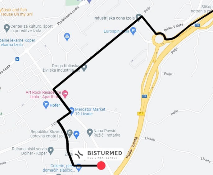 At the highway exit (H5) in Izola, at the traffic circle, follow the signs to the city center. At the next traffic circle keep left and follow the signs to the industrial area (third exit on the left) and drive about 500 m on Industrijska cesta to the next traffic circle, where you take the third exit on the left and continue on Kajuhova cesta. At the next traffic circle, take the first exit on the right onto Južno cesta and at the next first intersection, after 100 m, turn left onto Cesta v Pregavor. After 200 m turn left onto Zelena street, at the end of which there is a parking lot and the Bisturmed Medical Center building.